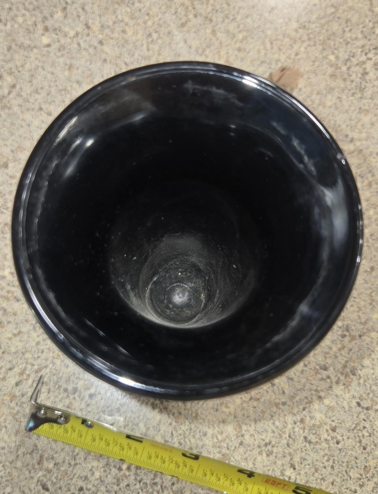 This is a vintage black amethyst glass bud vase with a sterling silver overlay floral pattern. The vase is 6" tall and 3" wide, and was manufactured in 1940. It features a glossy finish and a floral pattern, and is an original piece from the mid 20th century. The vase is a limited edition, souvenir item that is waterproof, stain-resistant, and fire-resistant. It is a decorative piece that would make a great addition to any collection.
