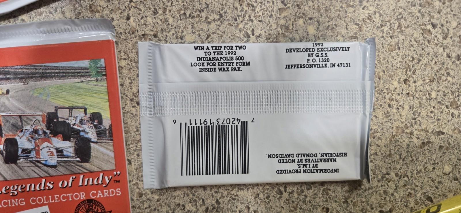 This listing is for 5 unopened factory sealed packs of 1992 Legends of Indy racing collector cards. Each pack contains 10 cards made of high-quality card stock. The cards feature cars and drivers from the Indy Car franchise and are a great addition to any vintage card collection. The set includes base set cards and limited edition and exclusive cards that will make your collection stand out. The cards are in English and were manufactured in the United States by Grand Strand Sports. Don't miss your chance to own these limited edition cards!
