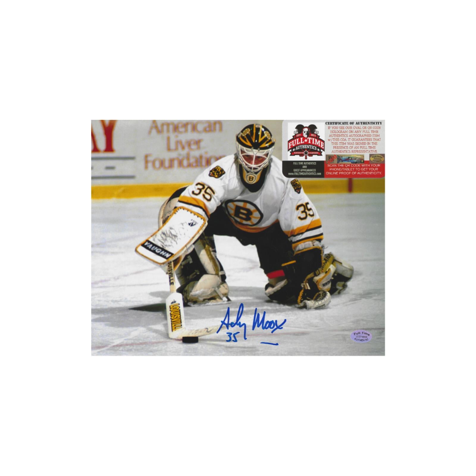 This is a fantastic opportunity for any Boston Bruins fan or memorabilia collector: an 8x10 photo of the legendary Andy Moog, personally autographed by the goalie himself. The image captures Moog in action, showcasing his impressive skills and dedication to the game during his time with the Bruins. Accompanying the photo is a Certificate of Authenticity (COA), ensuring that this signature is genuine and adding value to the piece. Whether you’re looking to enhance your sports collection or searching for the perfect gift for a fellow fan, this signed photo is a remarkable find that celebrates Moog's significant contributions to the Bruins' legacy.