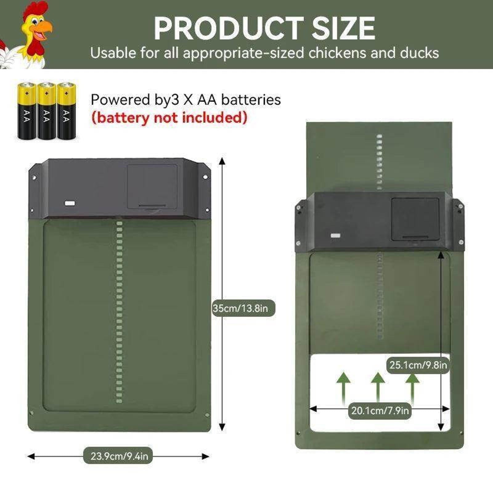 Upgrade your chicken coop with our Automatic Chicken Coop Door Opener. It's battery powered, light-sensitive, and waterproof, making it perfect for all weather conditions. Its ABS house gate provides secure access for your pets while saving you time and hassle. Experience the convenience and reliability of our expertly designed coop door opener.