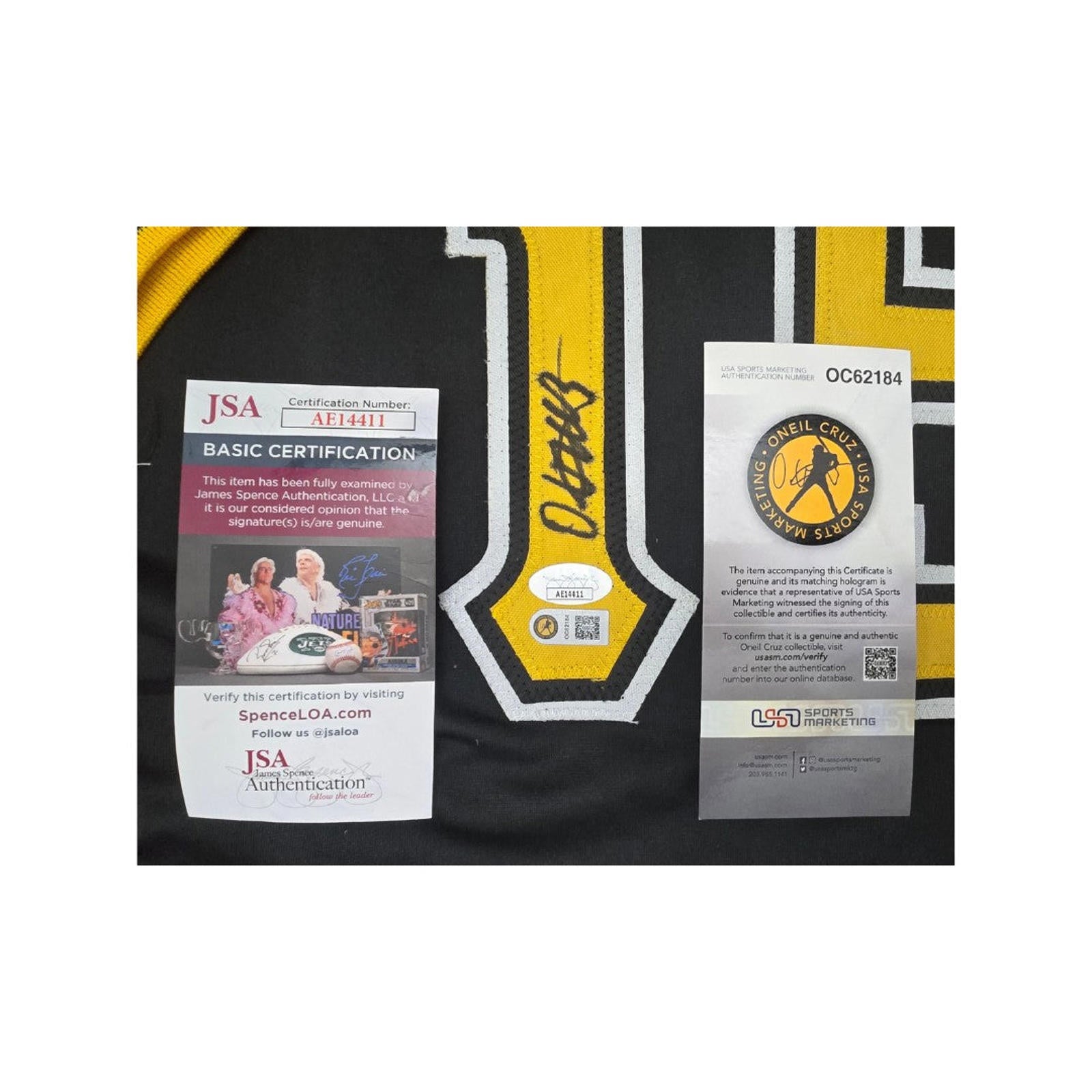 This is a signed Oneil Cruz baseball jersey from the Pittsburgh Pirates, featuring a sleek black design that showcases the team's colors and logo. The jersey comes with a certificate of authenticity from JSA (James Spence Authentication) and USA Sports Memorabilia, ensuring that the autograph is genuine and adding value for collectors and fans alike. The fabric is high-quality and designed for comfort, making it perfect for wearing to games or displaying in a collection. Whether you're a die-hard Pirates supporter or simply a fan of Oneil Cruz, this jersey is a fantastic piece to own, representing both team spirit and a personal connection to a rising star in Major League Baseball.