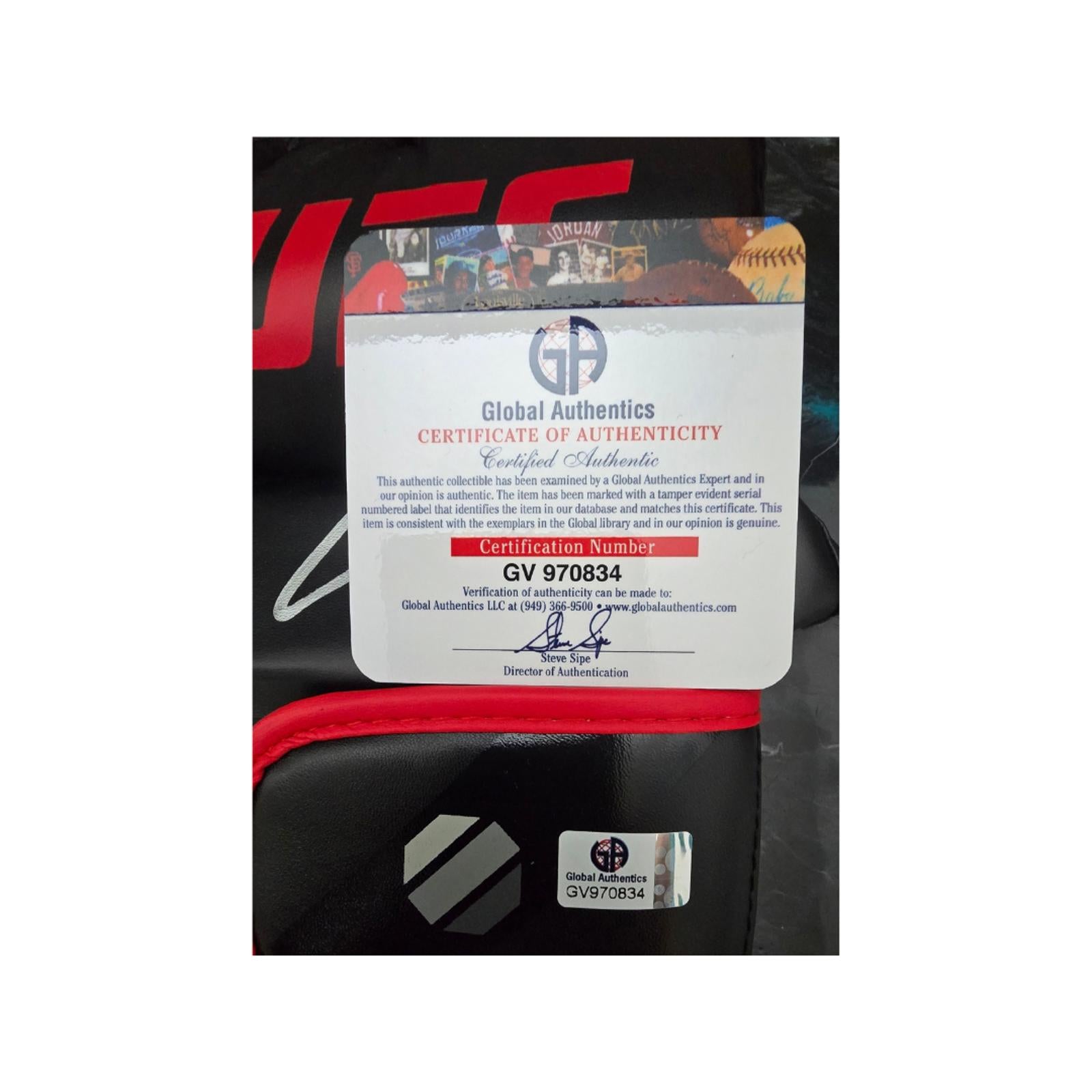 Conor McGregor's UFC autographed 6oz MMA glove, complete with a Certificate of Authenticity (COA), is a remarkable collectible for any mixed martial arts enthusiast or sports memorabilia aficionado. This glove, designed specifically for the rigors of professional competition, showcases McGregor's signature, adding a personal touch that enhances its value and appeal. The 6oz weight is standard for UFC bouts, making this glove not only a piece of art but also a representation of the sport's high-stakes environment. The inclusion of a COA ensures that the autograph is genuine, providing buyers with confidence in their purchase. Whether displayed in a case or used as a conversation starter, this glove serves as a testament to McGregor's illustrious career and his impact on the world of MMA.