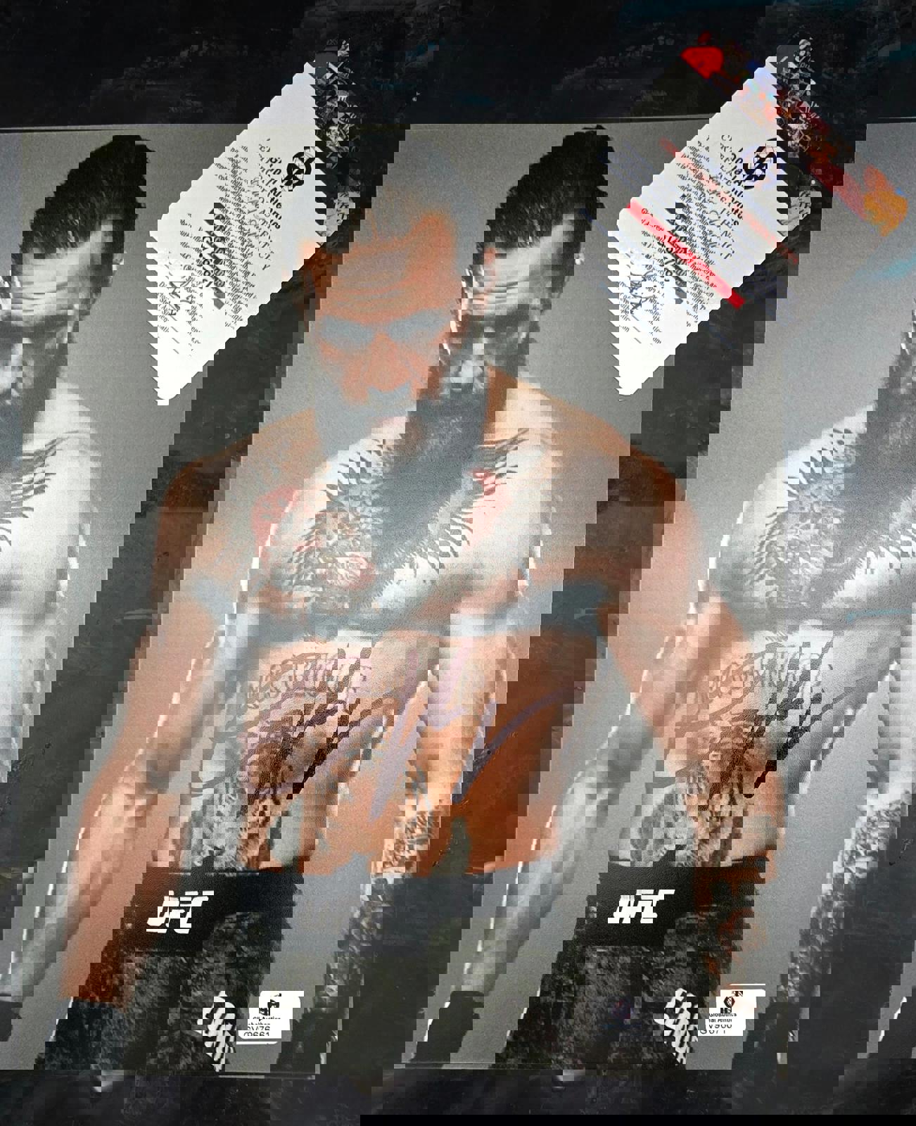 Conor McGregor UFC Autographed 8x10 Photo with Certificate of Authenticity (GA coa). This stunning photograph captures the essence of McGregor's dynamic fighting style and charismatic personality, making it a must-have for any fan of mixed martial arts. The 8x10 size is perfect for display, whether in a personal collection or as part of a larger sports memorabilia showcase. Each photo comes with a Certificate of Authenticity, ensuring that the signature is genuine and adding value to the piece. This collectible not only celebrates McGregor's achievements in the UFC but also serves as a striking visual reminder of his impact on the sport.