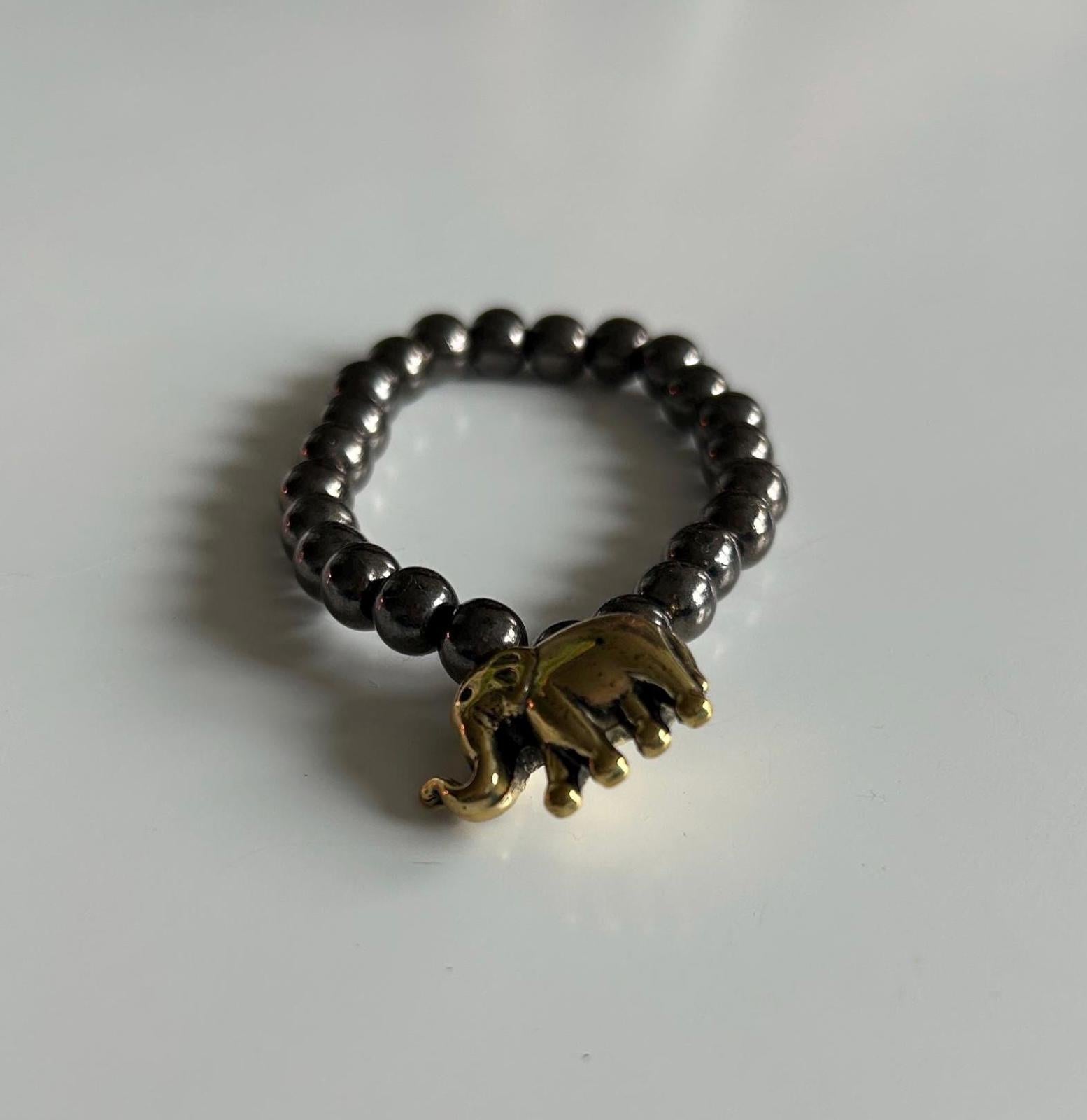 This bracelet features a series of small, round black beads strung together to form a simple yet elegant design. A golden elephant charm is attached to the bracelet, adding a touch of sophistication and symbolism. The black beads have a subtle sheen, and the golden elephant charm is intricately detailed.