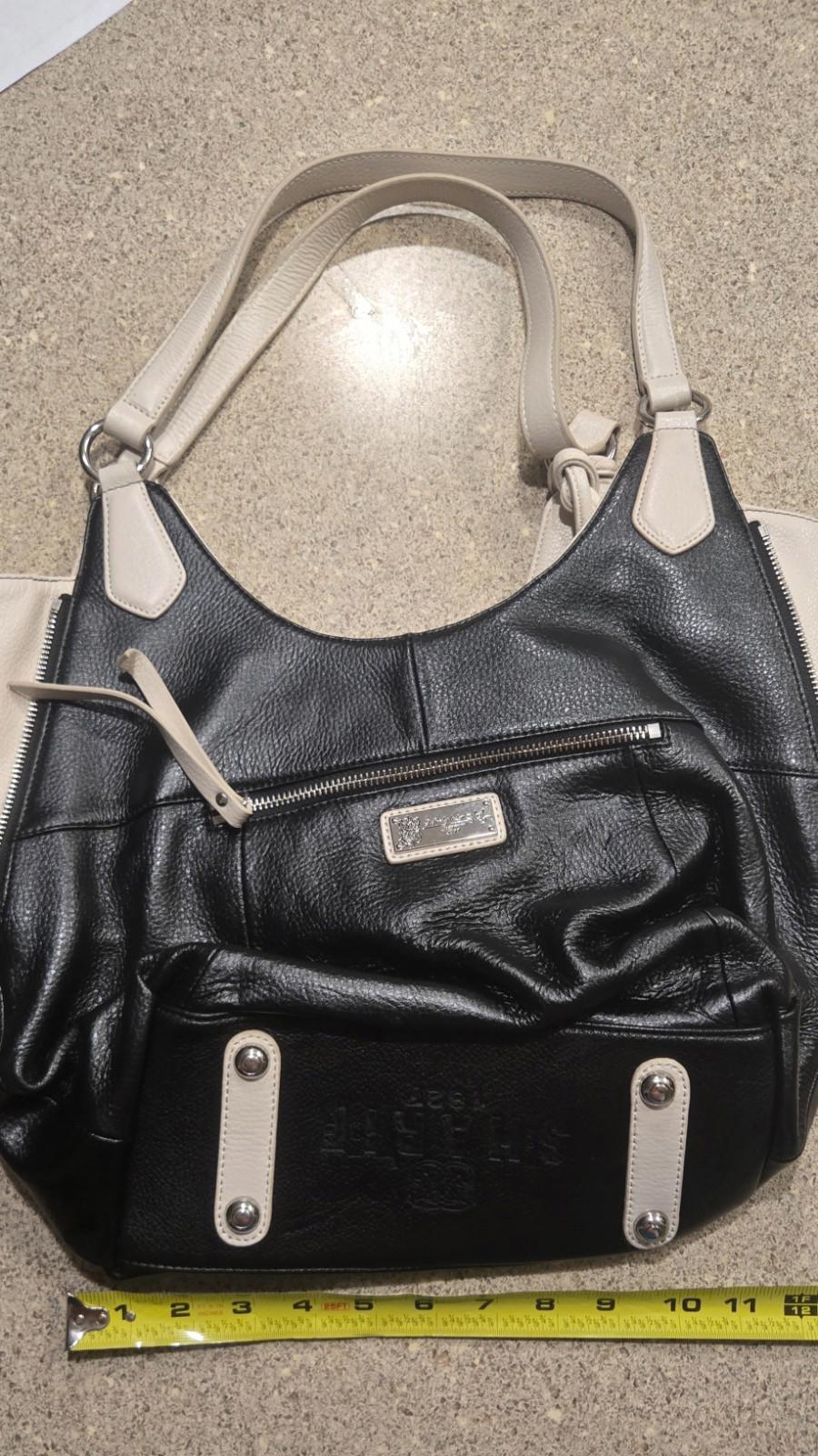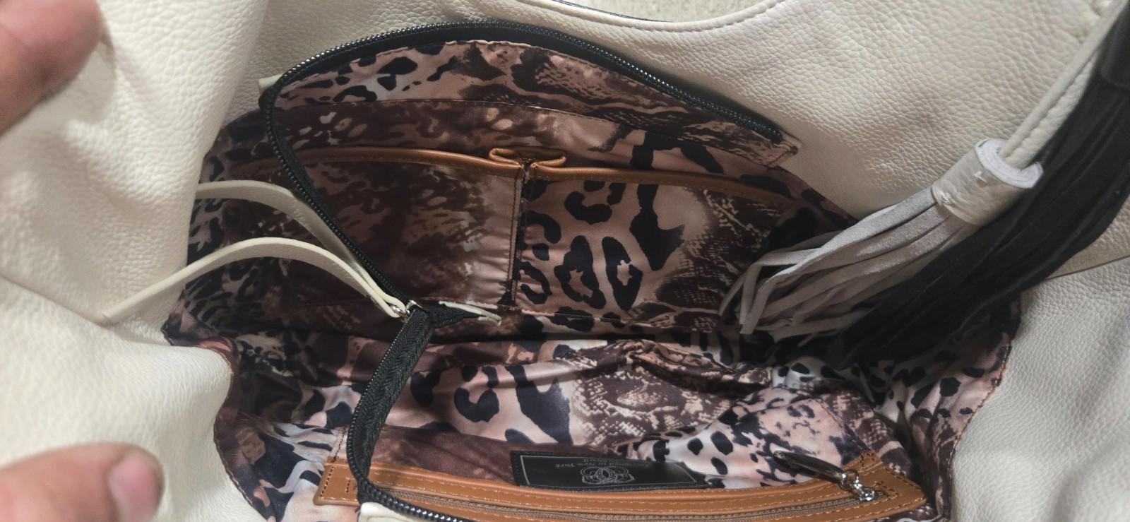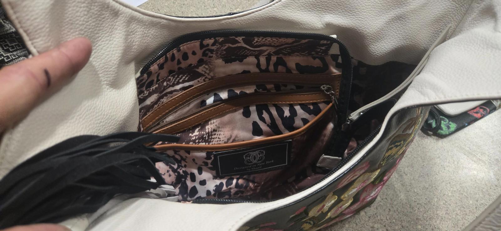 This Sharif Purse is a medium-sized, rectangle-shaped satchel/top handle bag made with black exterior leather and cream handle/strap. It features intricate embroidered floral accents, silver hardware, and inner pockets for organization. Handmade with a fabric lining in multicolor, this purse is perfect for travel, casual outings, or business meetings. The double handles make it easy to carry, while the zip closure ensures your belongings are secure. The luxurious finish and unique design make it a stylish accessory for any woman's wardrobe.