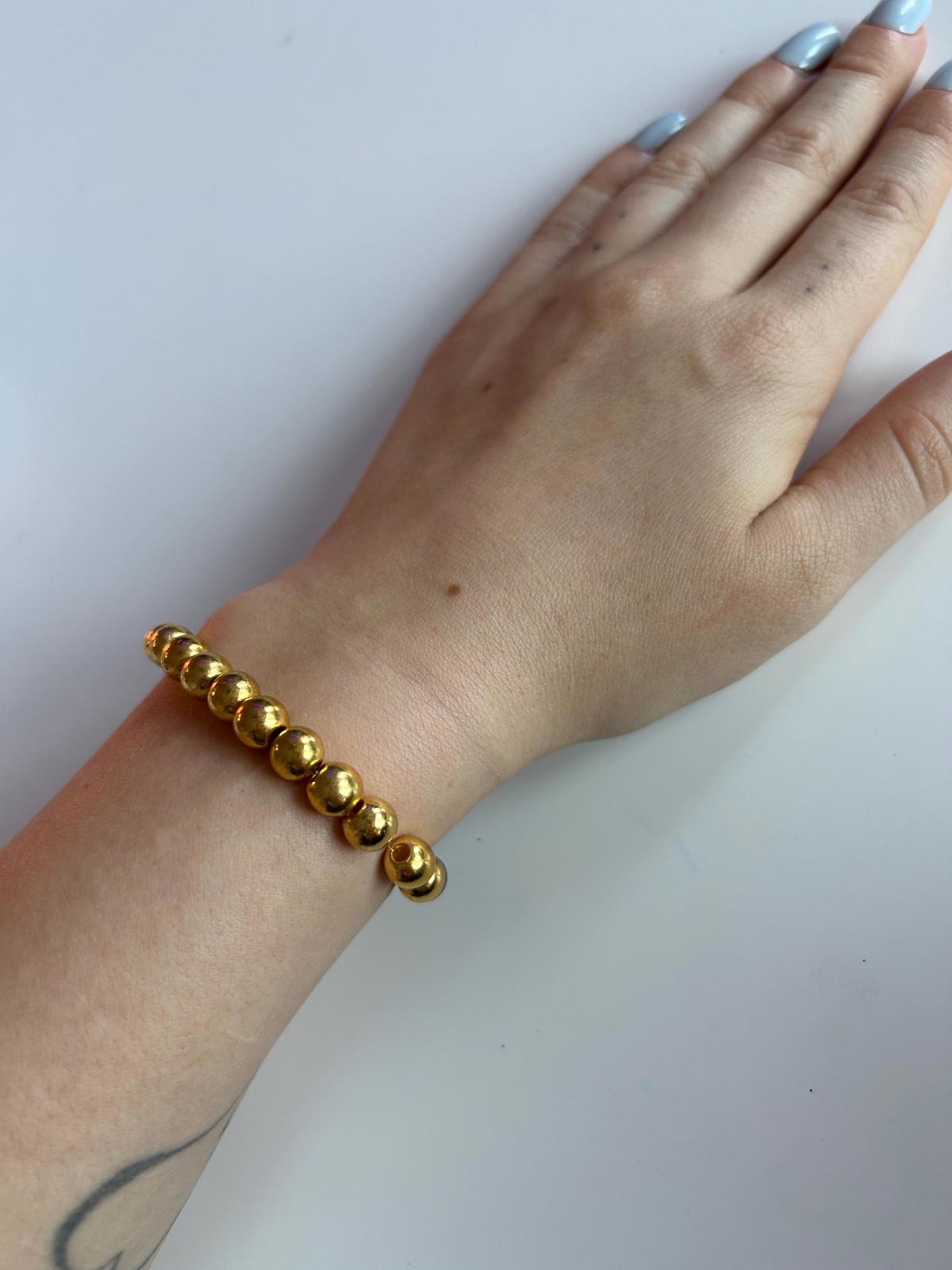 a beaded ring with a striking color scheme, featuring a mix of black and gold beads. The beads are divided into two distinct sections: one half is black, while the other half is gold. The black beads are on the left side of the ring, and the gold beads are on the right side, creating a visually appealing contrast. The overall effect is one of simplicity and elegance, making the ring a stylish and understated accessory.