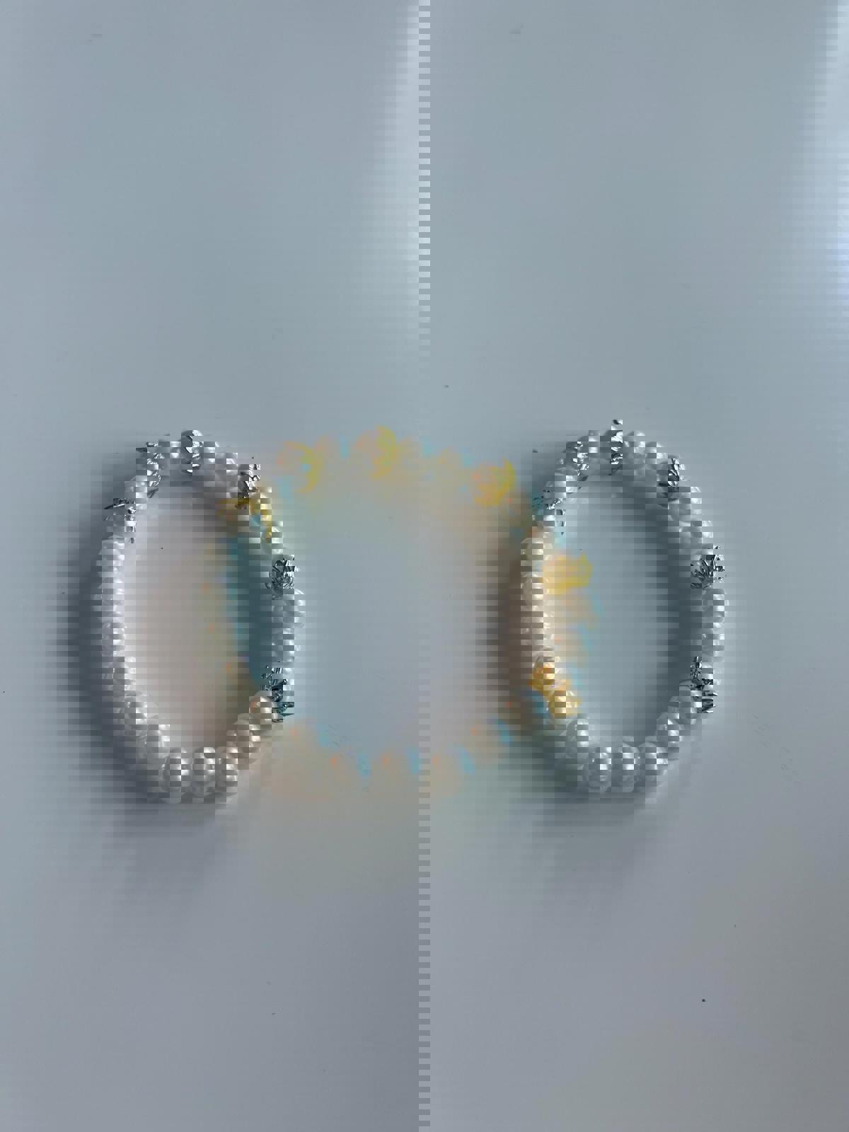 This bracelet is a delicate and elegant piece of jewelry featuring white pearls and gold leaf-shaped accents. The pearls are strung together in a simple yet sophisticated design, with the gold leaves adding a touch of subtle luxury. The combination of white and gold creates a harmonious and calming visual effect, making it suitable for everyday wear or as a special occasion accessory. The bracelet's understated beauty allows it to complement a variety of outfits, from casual to formal.