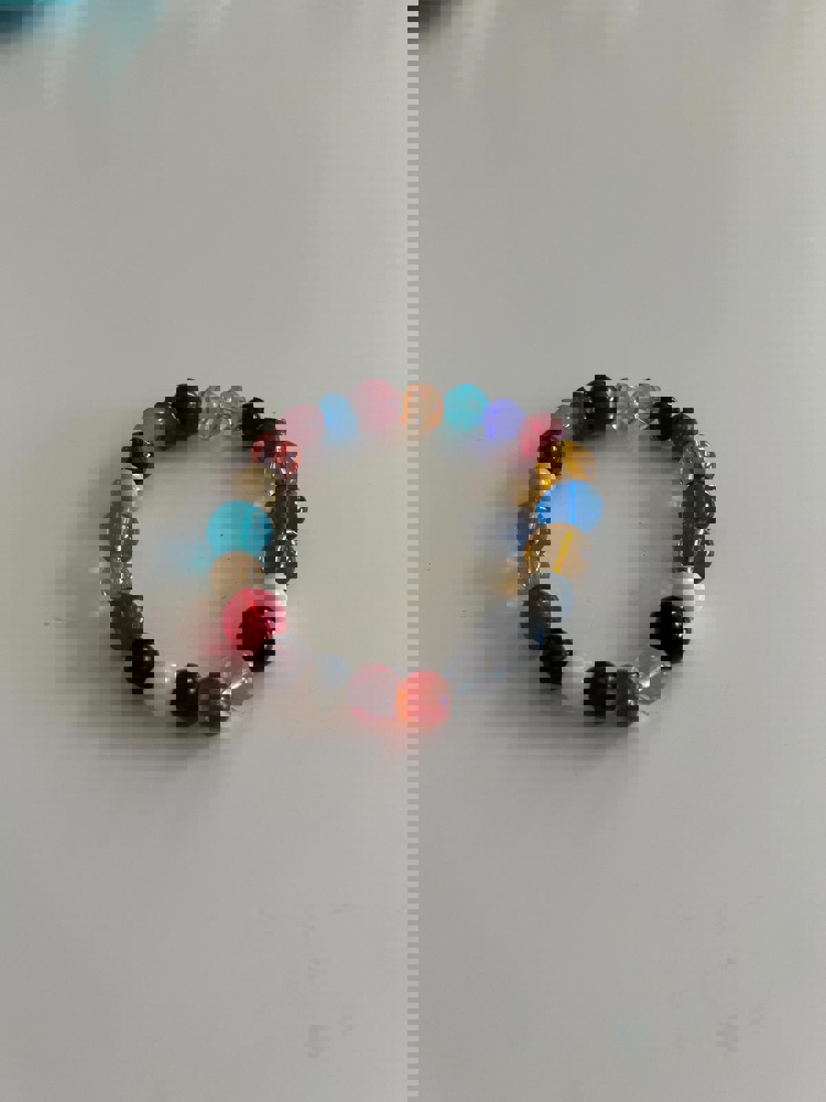 Add a pop of color to your outfit with this unique beaded bracelet. Featuring a mix of red, blue, black, white, gold, and pink beads, this handmade accessory is perfect for anyone looking to make a statement. The round, shiny beads are carefully arranged to create a visually appealing pattern. Made with high-quality materials, this bracelet is durable and long-lasting. Pair it with your favorite outfit for a stylish and eye-catching look.
