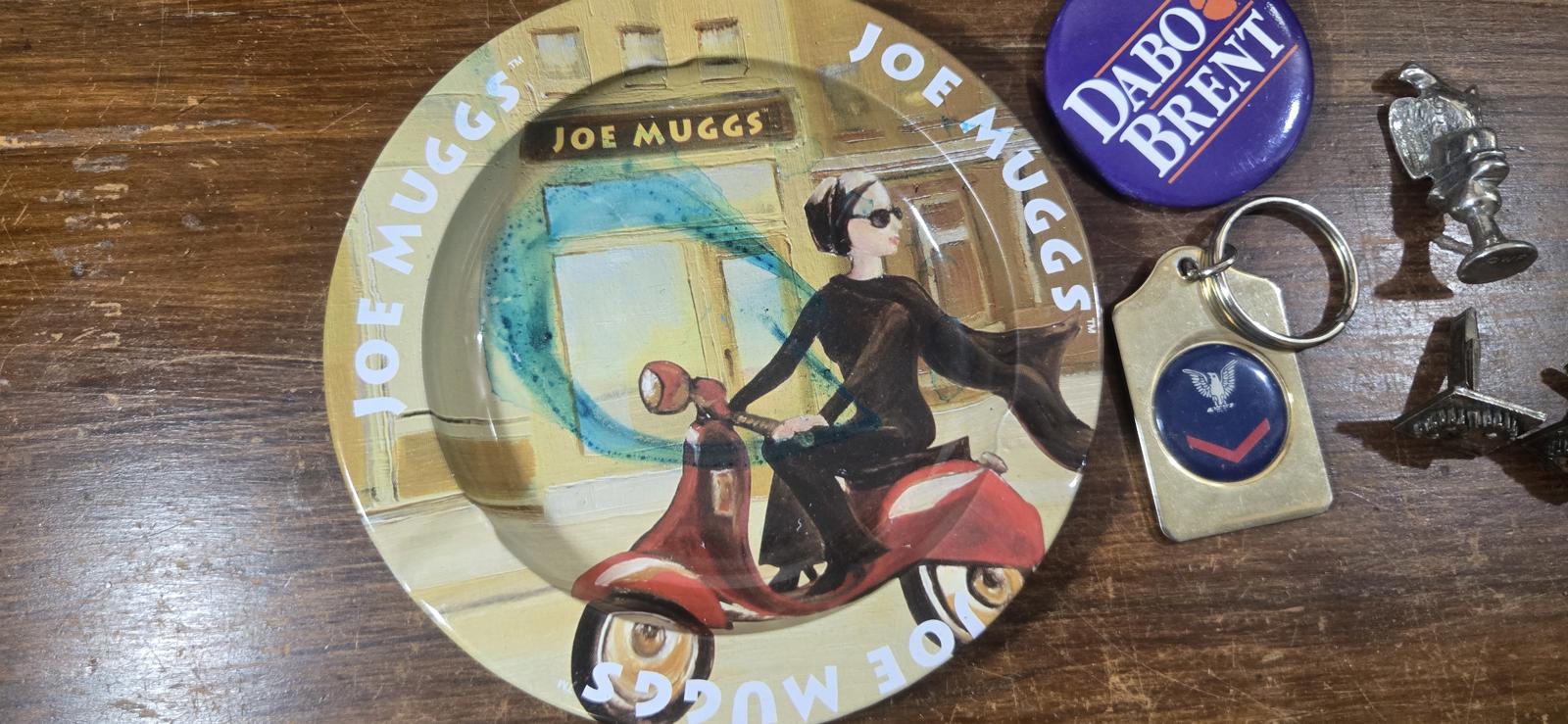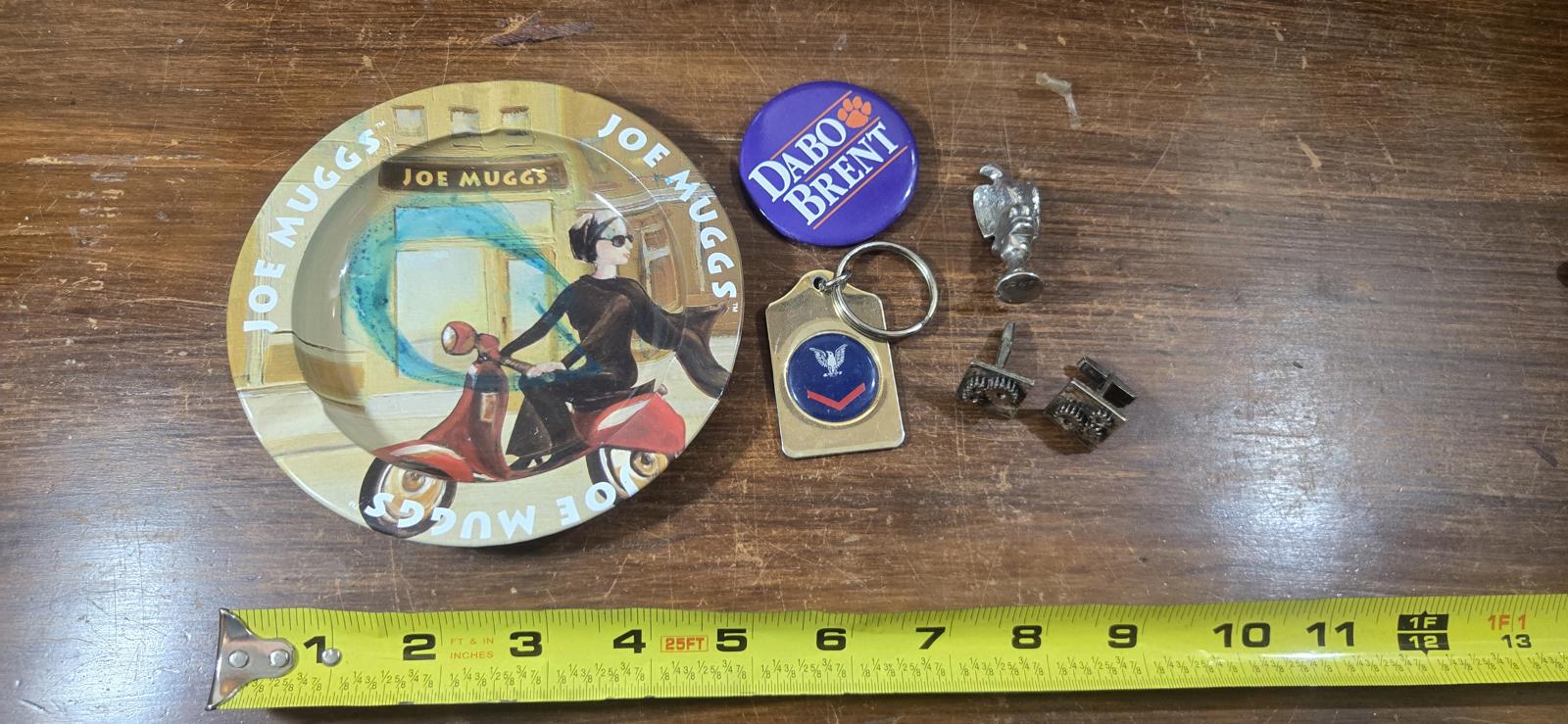 Includes a Joe Mugg ashtray, a DARO BRENT pin, a military insignia keychain, and other small pins.