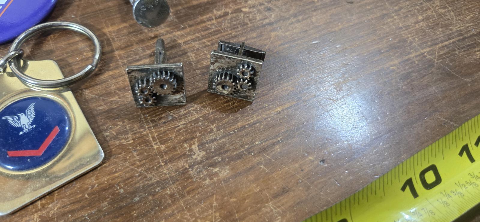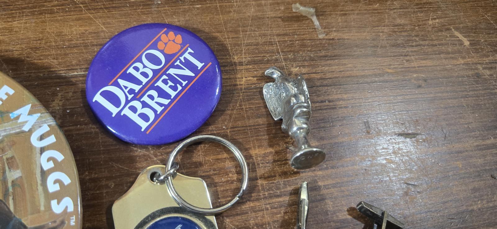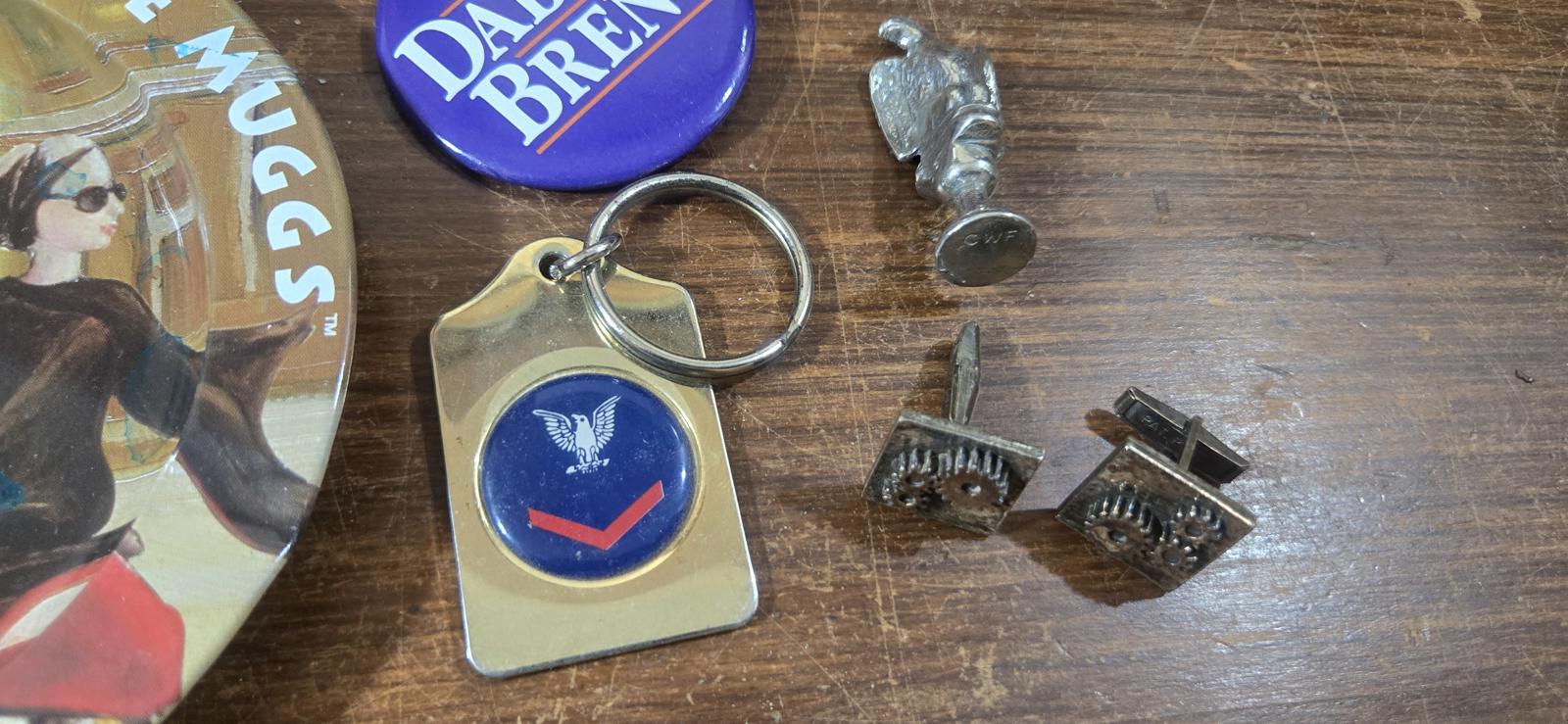 Vintage Mixed Collectible Pins, Keychains, Cuff Links, Ash Tray, Political. Lot