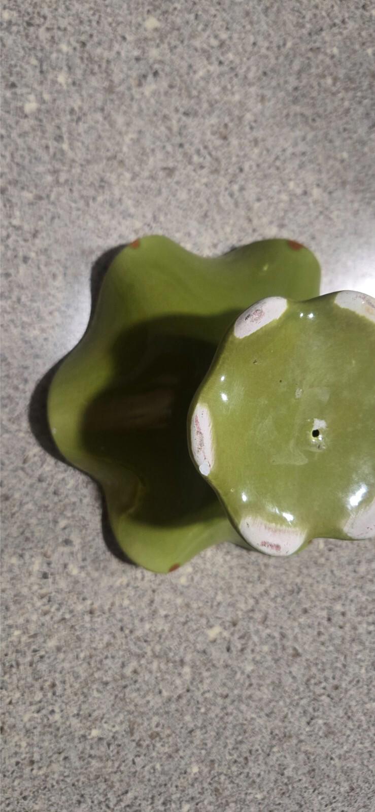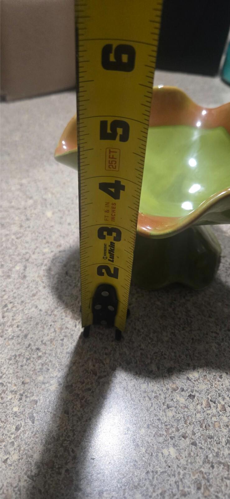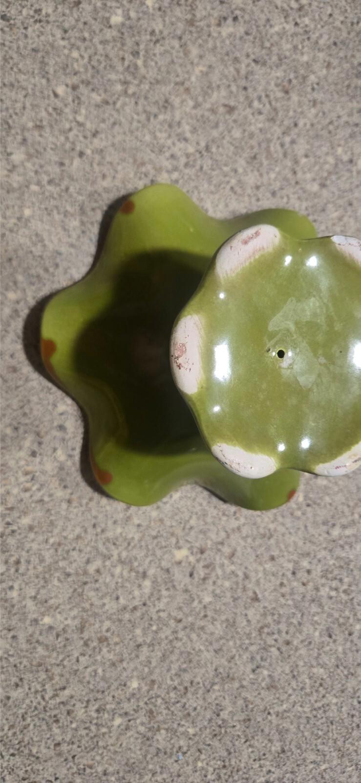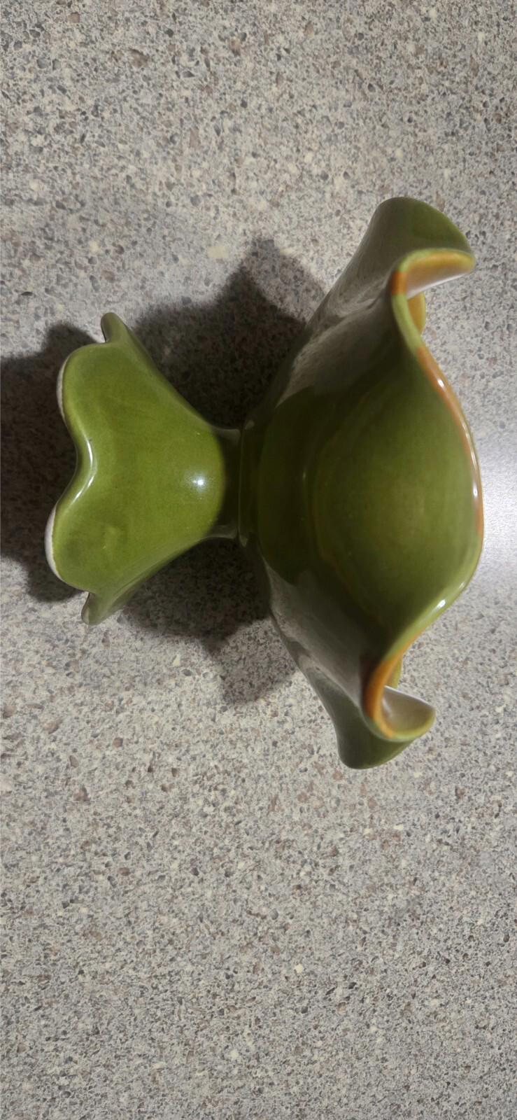 Elevate your home decor with the vintage charm of a mid-century modern (MCM) ceramic pedastool bowl. The piece features a striking green and rust orange color palette, complemented by a ruffled edge design that adds a touch of elegance and sophistication to any space.Crafted from high-quality ceramic, this unmarked bowl is a testament to the timeless design and craftsmanship of MCM era. Ideal for use as a decorative accent or as a functional serving piece, it promises to be a versatile addition to your collection. Whether placed on a mantle or used to serve guests, this pedastool bowl is sure to make a statement.